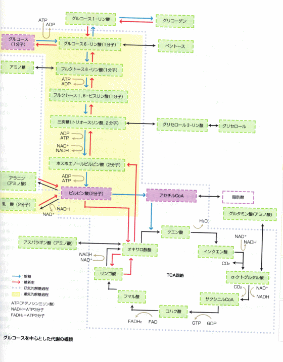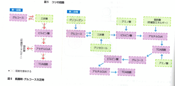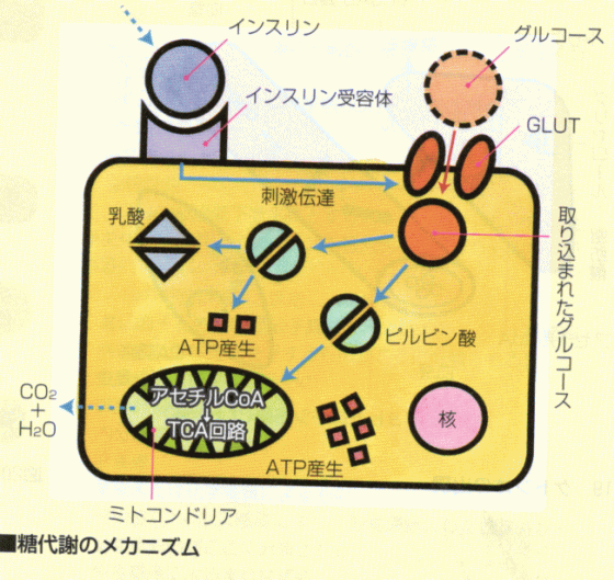 糖尿病は細胞の飢餓状態で、その原因はインスリンの分泌低下またはインスリンの作用の低下があり、また飢餓状態や、糖尿病ではグルコースを利用できないので、脂肪組織から脂肪酸が肝臓でβ酸化され、多量のアセチルCoAが産生され、肝臓においては糖新生でオキサロ酢酸を消費し、アセチルCoAはクエン酸を合成することができず、ケトン体へ代謝されるような血液が酸性に傾くような危険な状態(ケトアシドーシス)に陥るということになります。 |