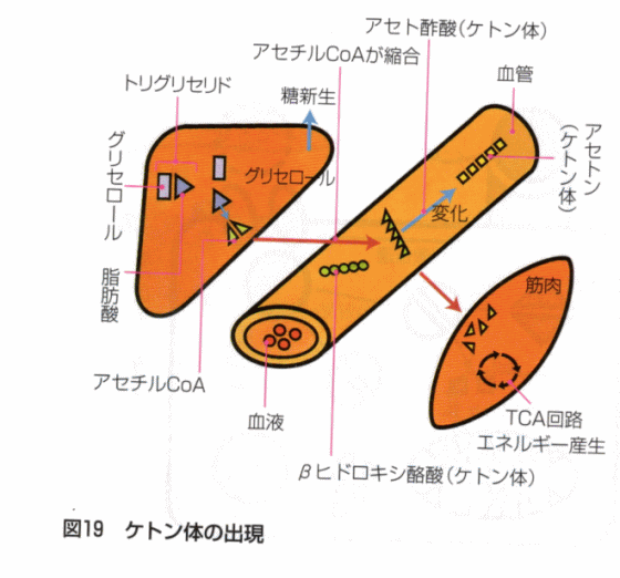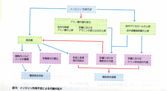 糖尿病は細胞の飢餓状態で、その原因はインスリンの分泌低下またはインスリンの作用の低下があり、また飢餓状態や、糖尿病ではグルコースを利用できないので、脂肪組織から脂肪酸が肝臓でβ酸化され、多量のアセチルCoAが産生され、肝臓においては糖新生でオキサロ酢酸を消費し、アセチルCoAはクエン酸を合成することができず、ケトン体へ代謝されるような血液が酸性に傾くような危険な状態(ケトアシドーシス)に陥るということになります。 |